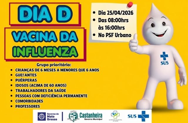 A Prefeitura de Castanheira, por meio da Secretaria Municipal de Saúde, realizará no próximo dia 25 de abril de 2026 o Dia D de vacinação contra a gripe. A ação acontecerá das 08h às 16h, no PSF Urbano, e integra a mobilização nacional de combate à Influenza, com o objetivo de ampliar a cobertura vacinal entre os grupos considerados prioritários.